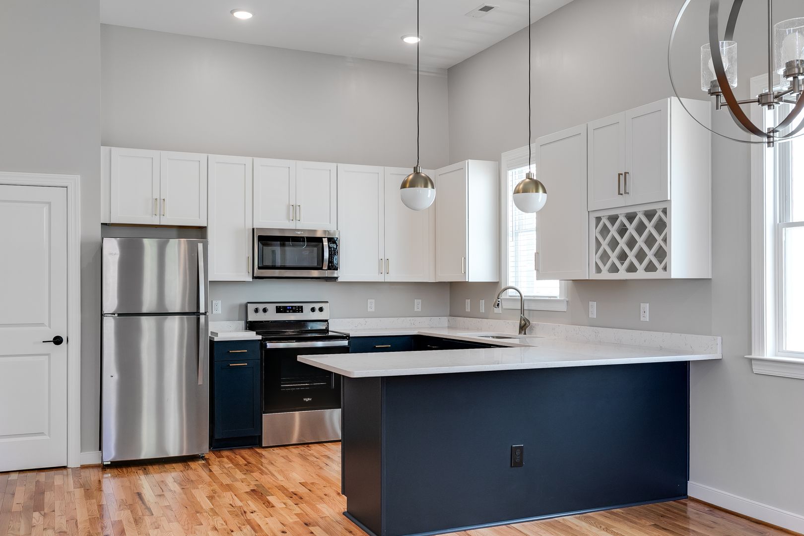 Step inside this recently built (Fall of 2023) two‑bedroom, two‑bath apartment and discover apartment living at its best. This unit is the entire upstairs apartment in an upstairs downstairs duplex and the living room + kitchen features 12-feet ceilings. Rich 3/4" solid oak hardwood floors flow throughout the home. The spacious, thoughtfully designed kitchen features luxury quartz countertops, a full suite of stainless-steel appliances (dishwasher and garbage disposal included), a built-in under‑counter trash can, and a convenient wine rack — all opening to a bright, expansive living area and a large covered rear patio for peaceful outdoor enjoyment.