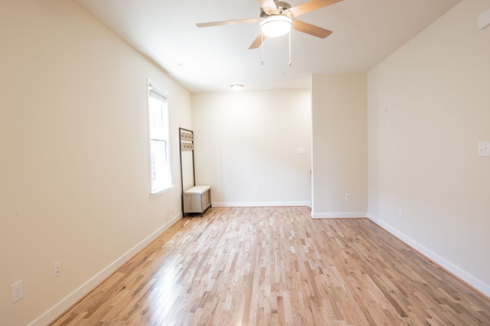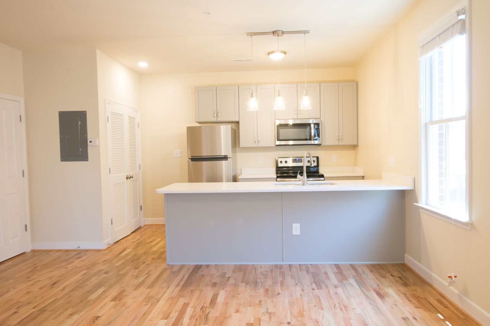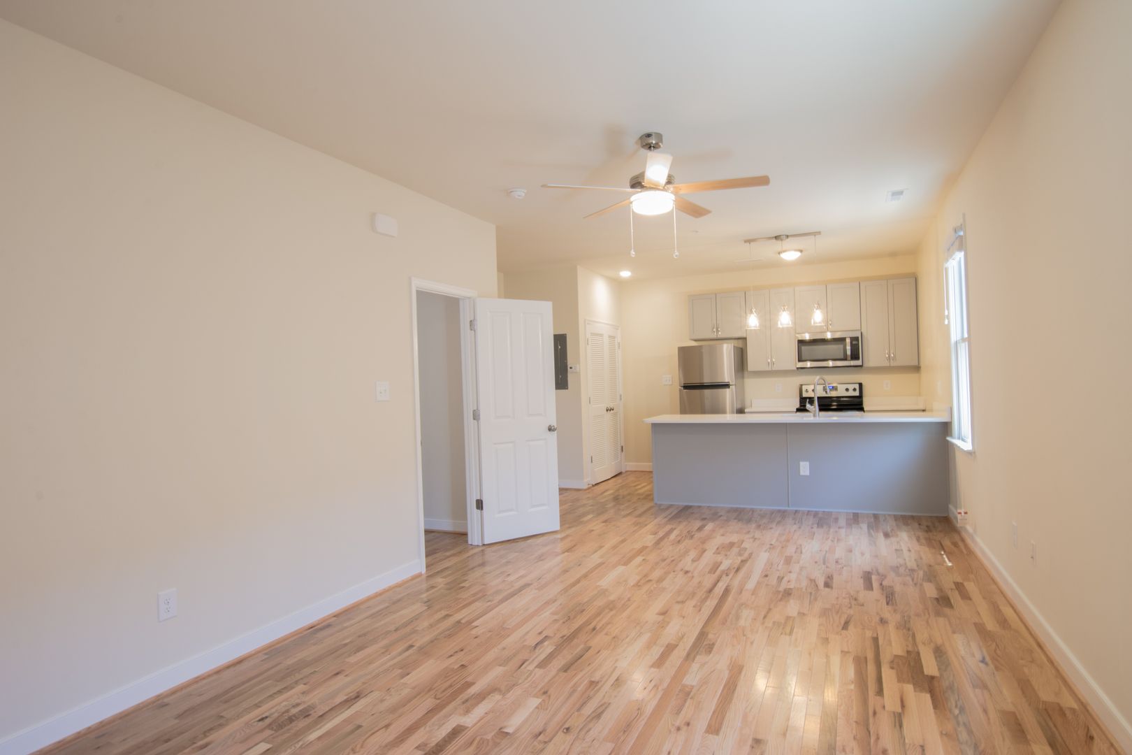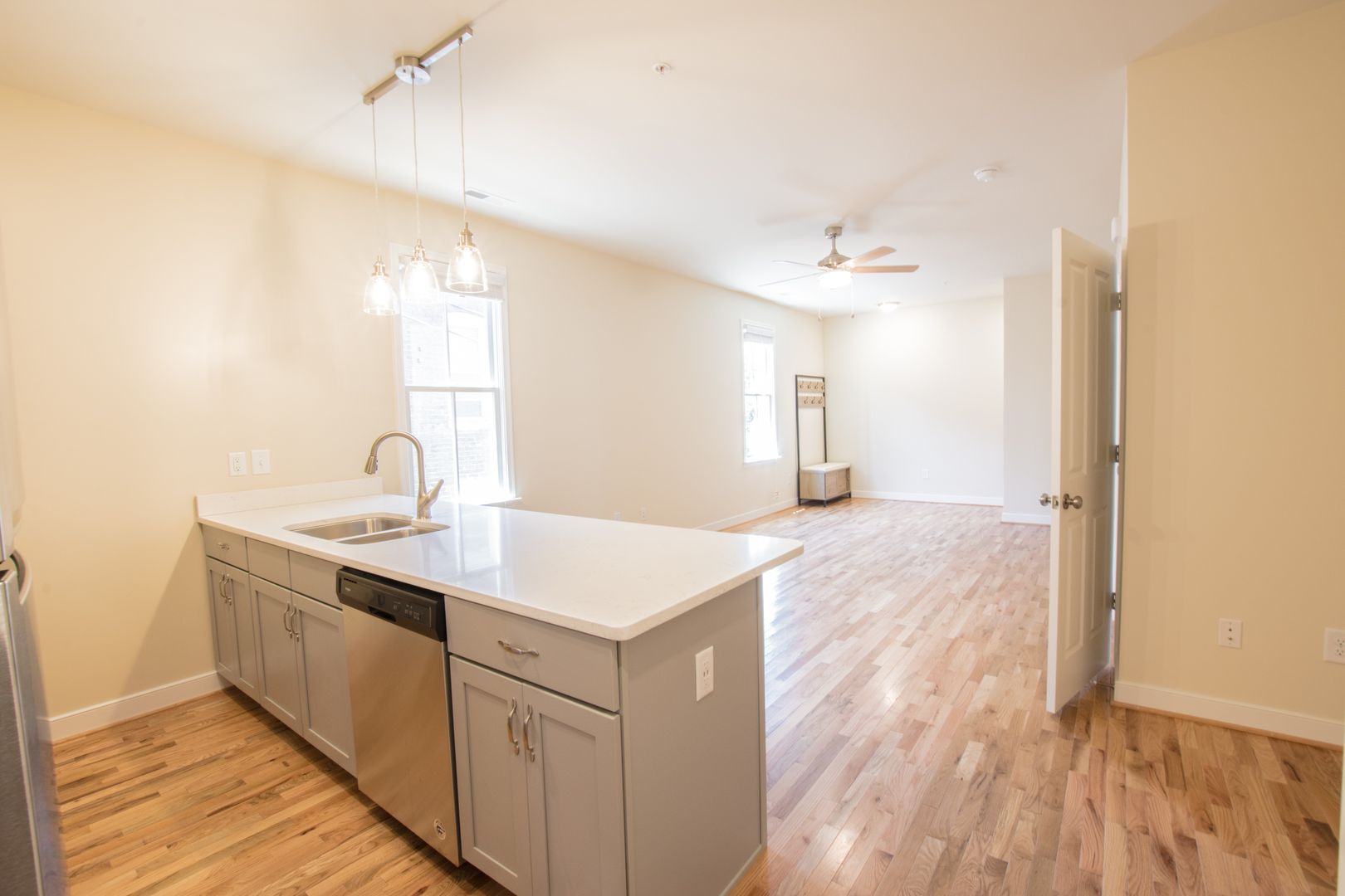 Enter the apartment on the side of the building through your own private entrance and head up a flight of stairs to this modern oasis. A coat rack & bench is the first stop to keep all your personal items nicely organized. From there, relax in the living room and make your way to your wide-open kitchen. The kitchen has quartz counter-tops and a huge bar perfect for dining-in & entertaining. If cooking is your forte, you'll love the your full set of stainless steel appliances including: refrigerator, oven/range, microwave, dishwasher & disposal. Directly past the kitchen you'll find a decent size nook perfect for a music center, home-office or anything else that you like.